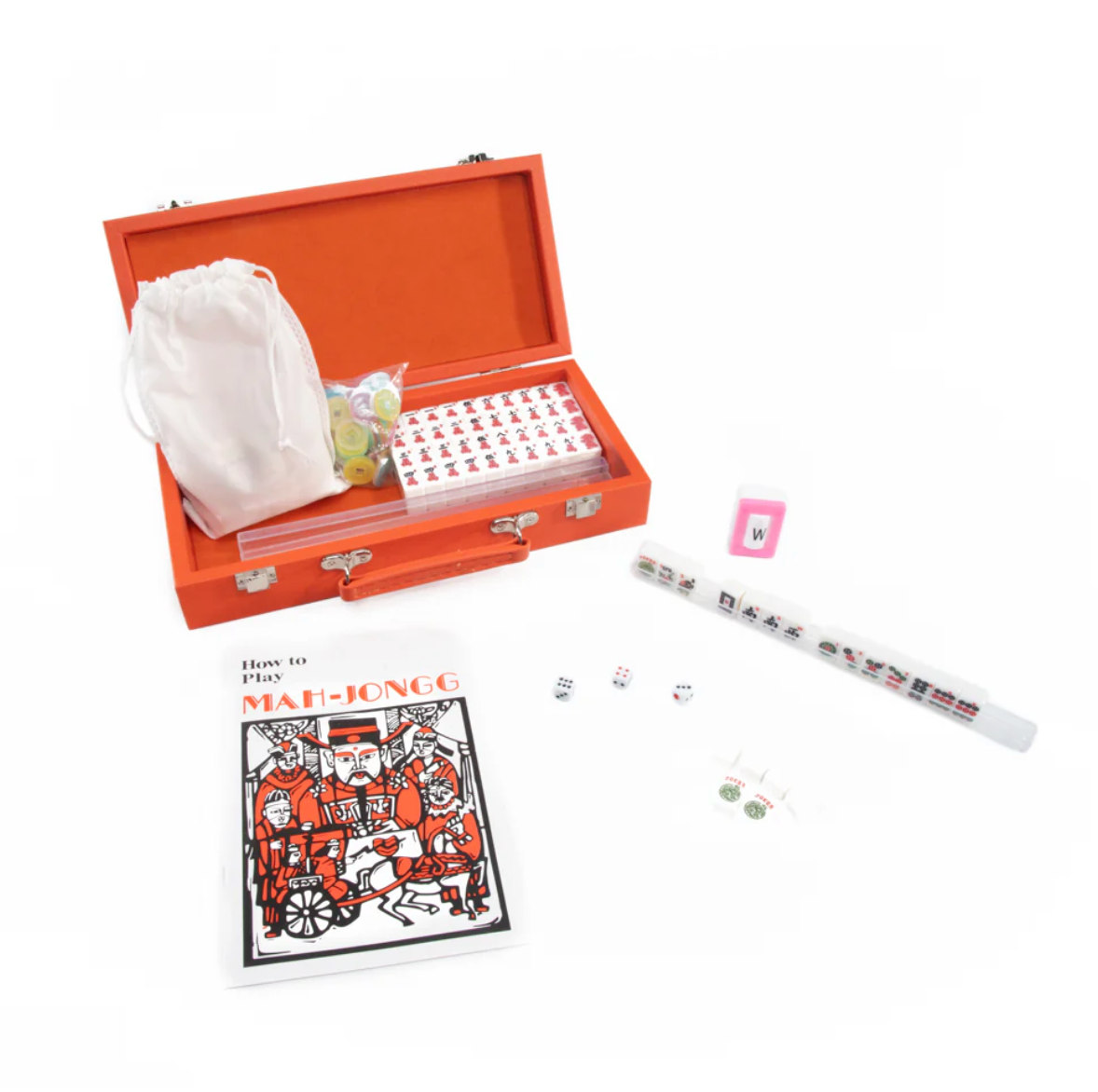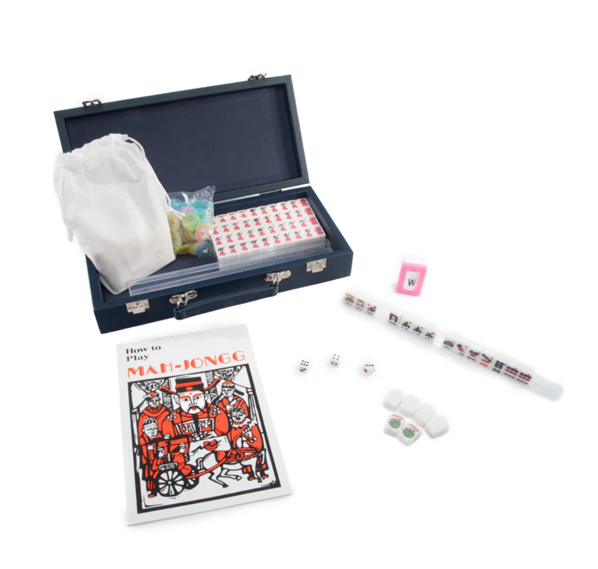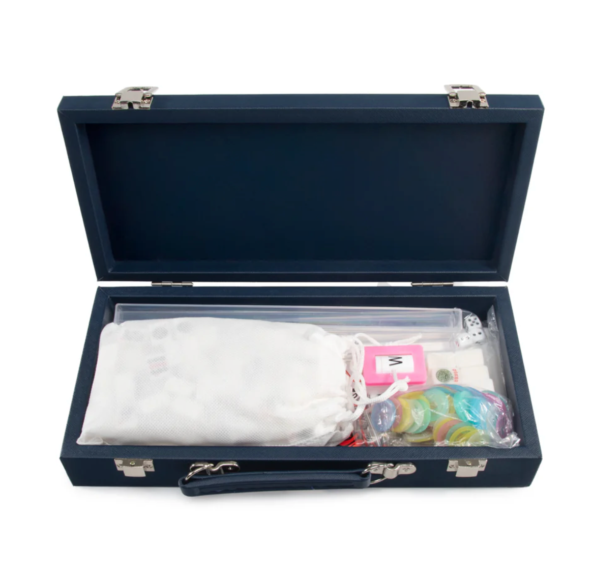 Our Mini Travel Mahjong Set is perfect for trips, journeys, or a fun game night at home! Compact and portable, it comes in a sleek vegan saffiano case with a handle for easy transport. Measuring just 12"x 5.625"x 2.25", it easily fits into your suitcase, backpack, or handbag. Despite its small size, this set includes everything you need for a great game. Inside are 4 clear acrylic trays to keep 166 premium 20mm tiles organized: 36 dots, 36 bams, 36 craks, 12 dragons, 16 winds, 16 flowers, 10 jokers, and 4 blank spares. It also includes 4 detachable acrylic pushers and stands, 3 large dice, 100 money chips, and 1 wind indicator. New to Mahjong? No worries! Clear instructions make it beginner-friendly but still fun for experts!