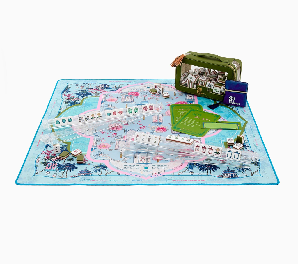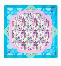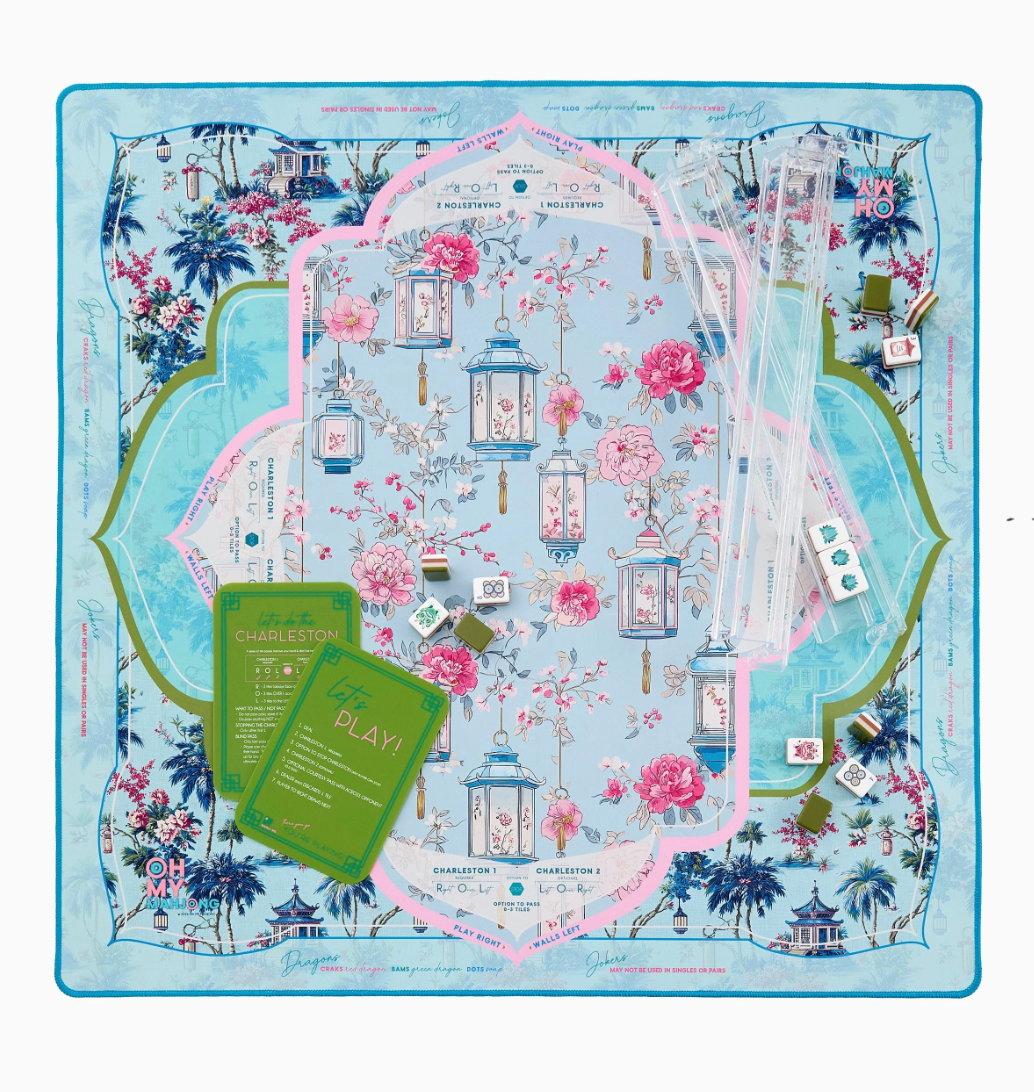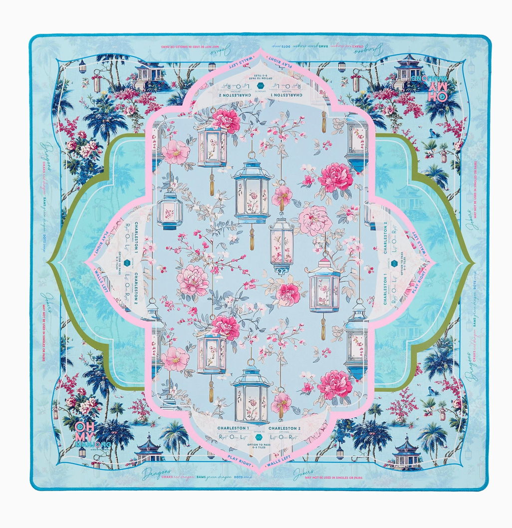 Introducing the Radiance Mat, a vibrant, artfully chic addition to your Mahjong setup, designed for those with a love for timeless aesthetics and curated traditional charm. Drenched in airy sky blue, soft pinks, and serene greens, this mat features a breathtaking landscape of majestic pagodas, hanging lanterns, and lush florals. It’s a beautifully layered design that feels both cosmopolitan and inviting — the perfect marriage of Palm Beach whimsy and timeless Chinoiserie charm.