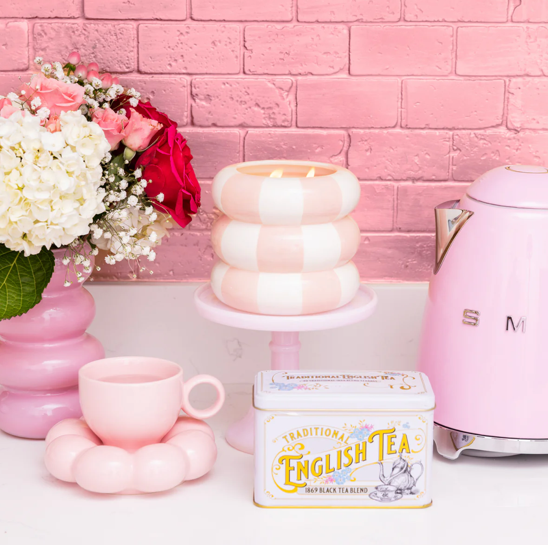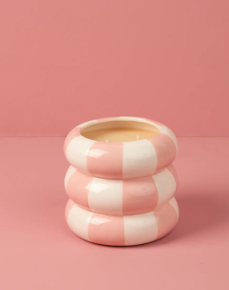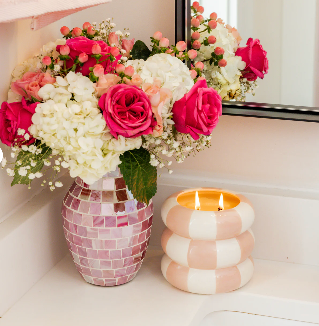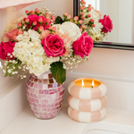 Add a playful pop of style with Sweet Grace Candle #074. Featuring a charming ceramic vessel adorned with a pink checkered pattern, this candle is a statement piece all on its own. Filled with 25.5 oz of our exclusive soy-blend wax, it offers up to 90 hours of burn time, filling your home with the beloved Sweet Grace fragrance you know and love.