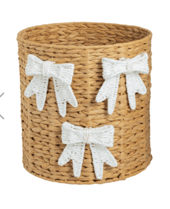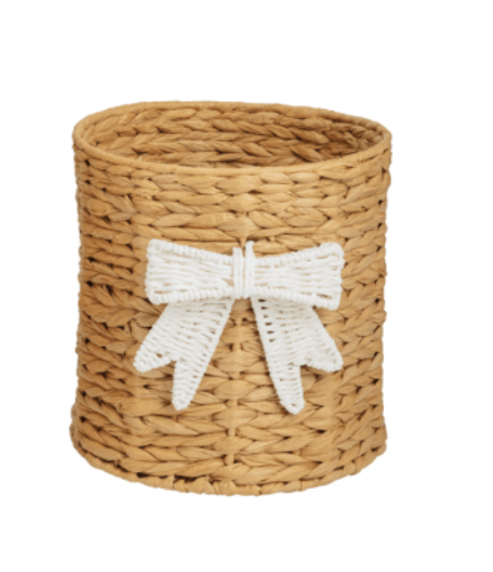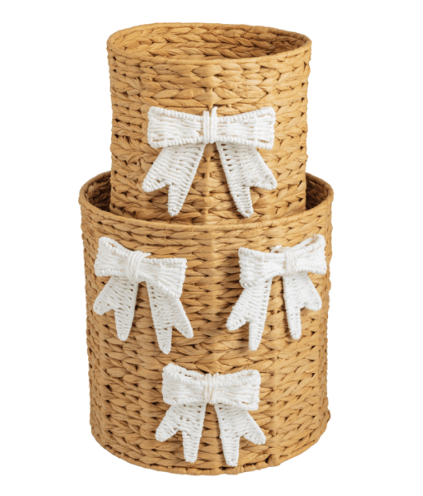 Woven Bow Baskets. This charming baskets: two beautifully crafted baskets made from natural water hyacinth, offering a rustic yet elegant touch to any space. Each basket features a unique design with contrast paper rope exterior bows, adding a playful and decorative element. The sturdy construction ensures durability, while the spacious interior provides ample storage for a variety of items, from blankets and toys to magazines and household essentials. Perfect for organizing and enhancing the aesthetic of your living room, bedroom, or bathroom, these baskets seamlessly blend functionality with style. The natural tones and textures complement a wide range of home decor styles, making them a versatile addition to your home.